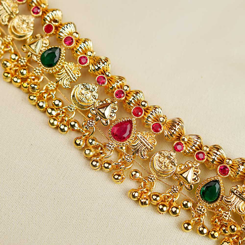 Inspired by temple jewellery with goddess motifs. Embellished with red and green stones. Paired with ethnic earrings.