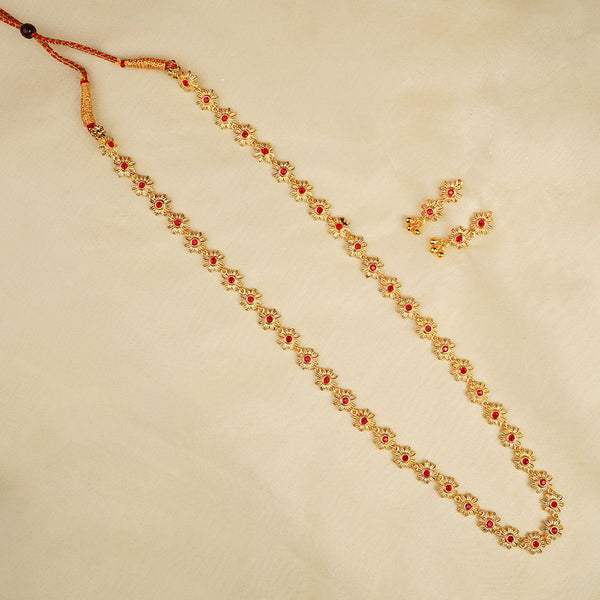 Classic single-line Bakuli Haar design. Embellished with red floral motifs and antique gold finish.