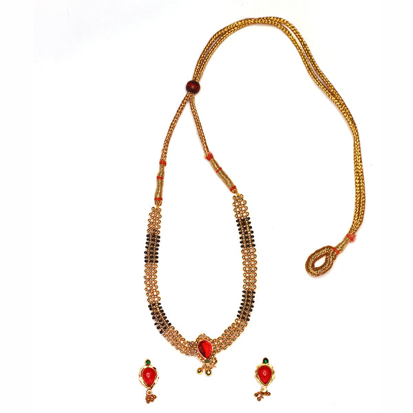 - All the beads are made from brass alloy and are gold-plated. All the beads are closely hand-woven in the necklace with good-quality thread to keep them intact and in place. There are five threaded(Pach padari)layers of black beads on one side of the necklace.