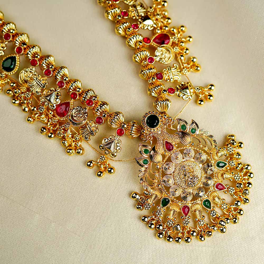 A majestic Kolhapuri Saaj with intricate motifs. Adorned with ruby and emerald stones. Perfect for weddings and festive occasions.