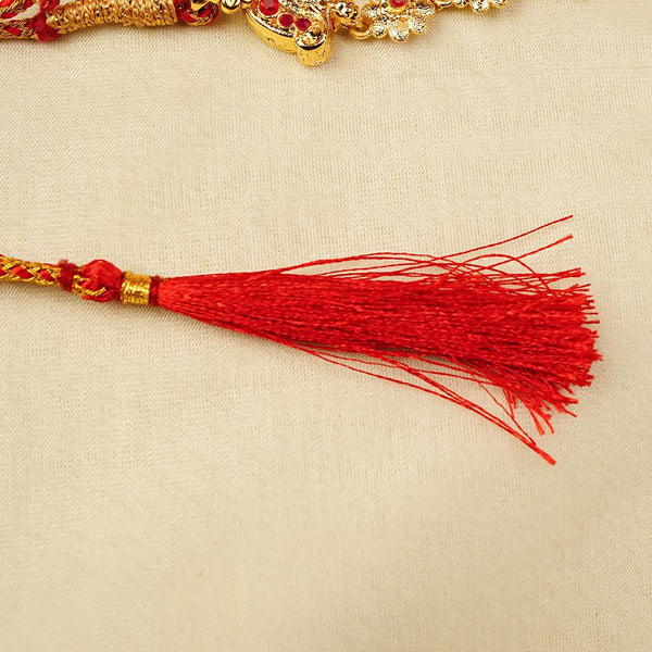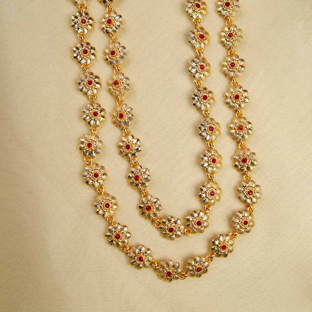 Two-line Bakuli Haar design with golden polish. Embellished with intricate floral red stone motifs.