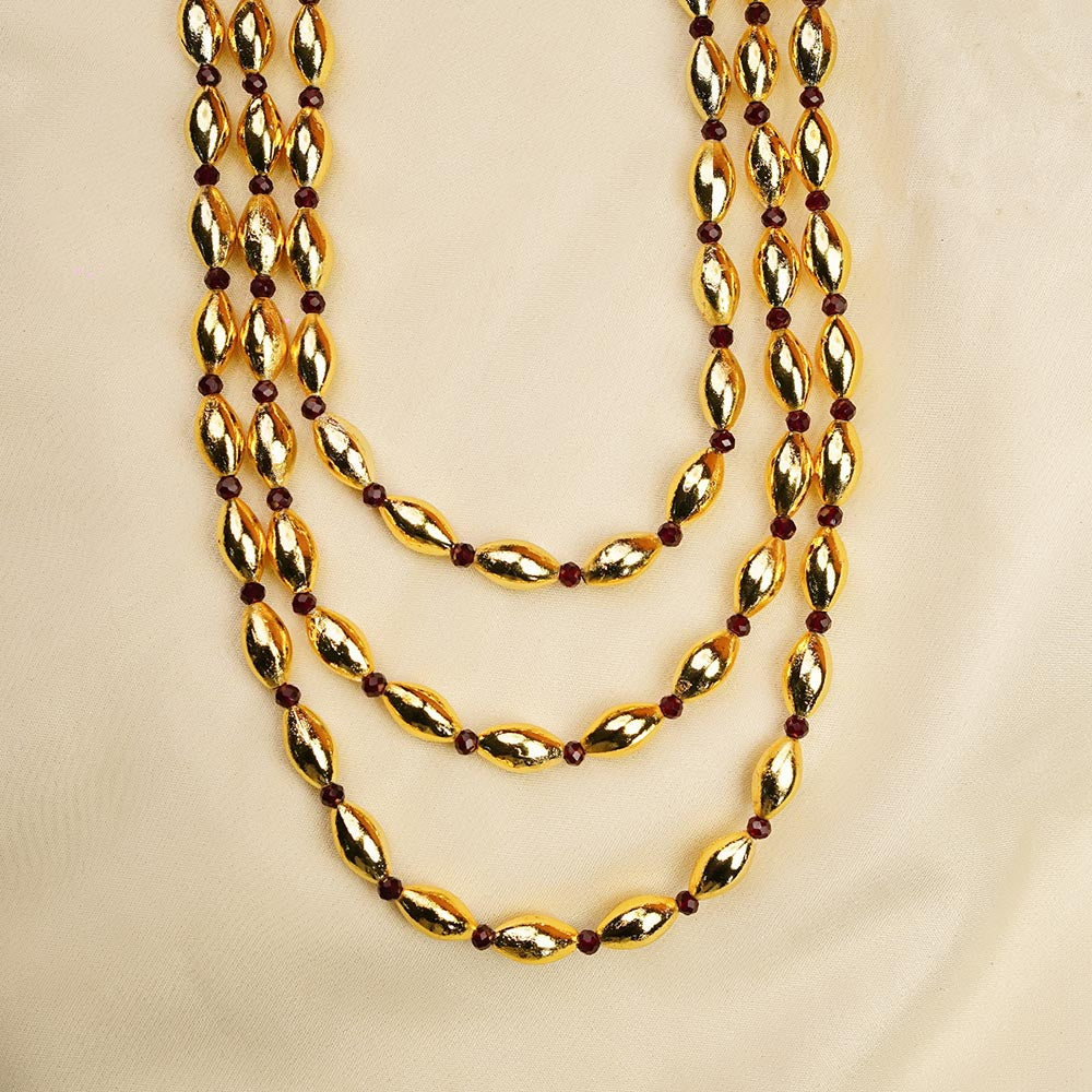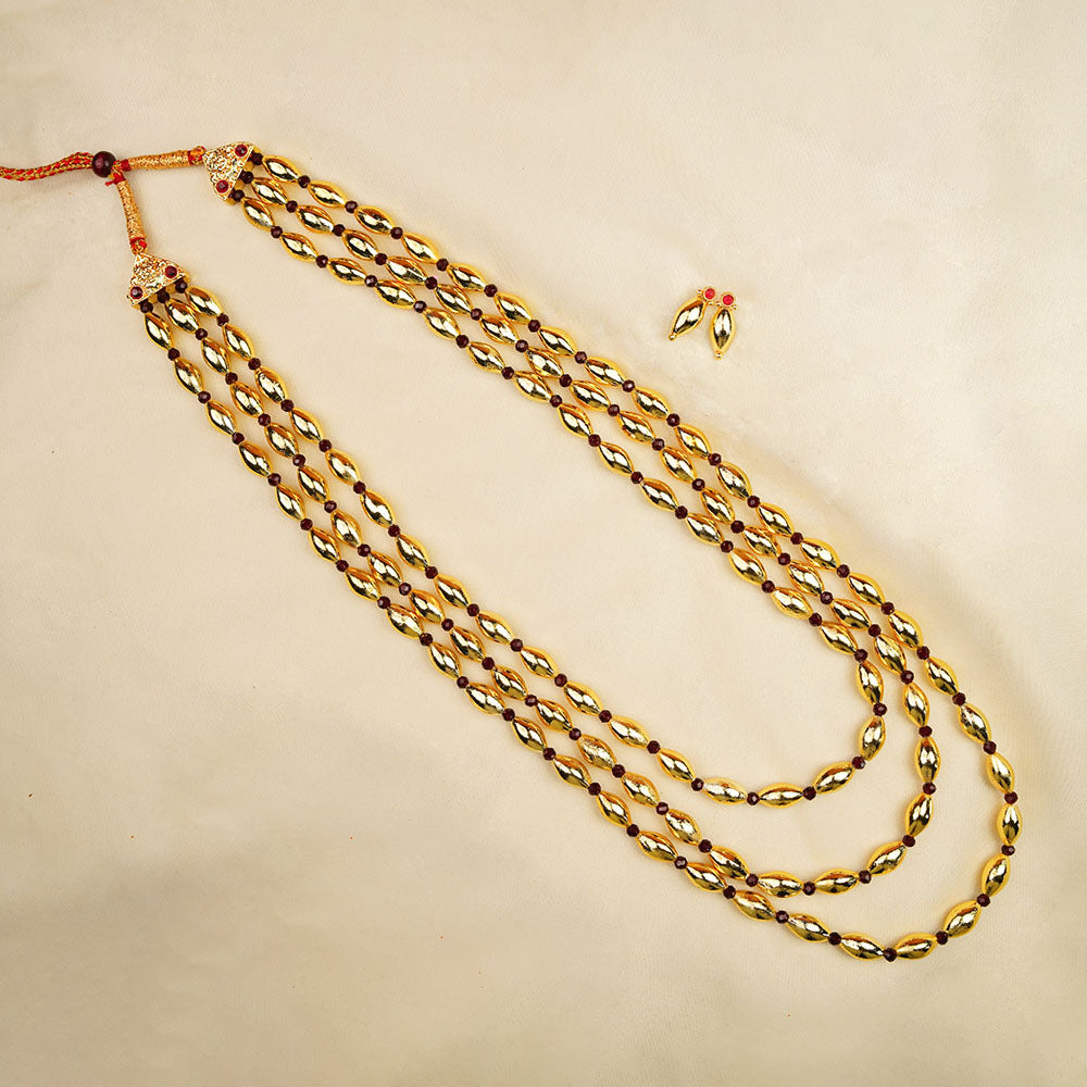 Exquisite three-line Bor Maal crafted with golden oval beads and red accents. A symbol of elegance and tradition.